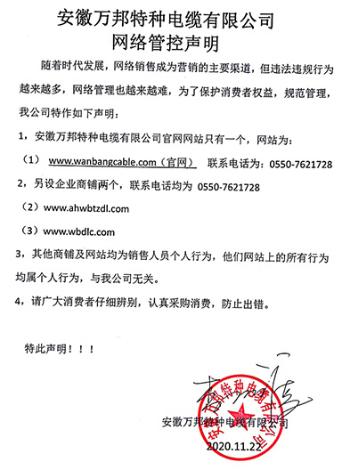鄭重聲明:安徽萬(wàn)邦特種電纜有限公司官方網(wǎng)站為:www_wanbangcable_com.123pay.com.cn,除此之外無(wú)任何子網(wǎng)站或合作網(wǎng)站,其余均為假冒偽劣。電話:0550-7621728 13485756353 地 址:安徽省天長(zhǎng)市滁州高新技術(shù)產(chǎn)業(yè)開(kāi)發(fā)區(qū)經(jīng)四路29號(hào)
